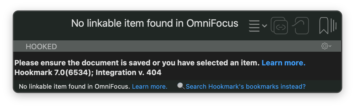 I’ve been using Hookmark with OmniFocus quite regularly, but somehow this stopped working recently. If I try to hook an OmniFocus item and invoke the Hookmark window, I get the message “No linkable item found in OmniFocus”. I have checked all the permissions detailed on your website regarding this error message, and could not get it to work. I am running the latest versions of both OmniFocus and Hookmark. Please help!