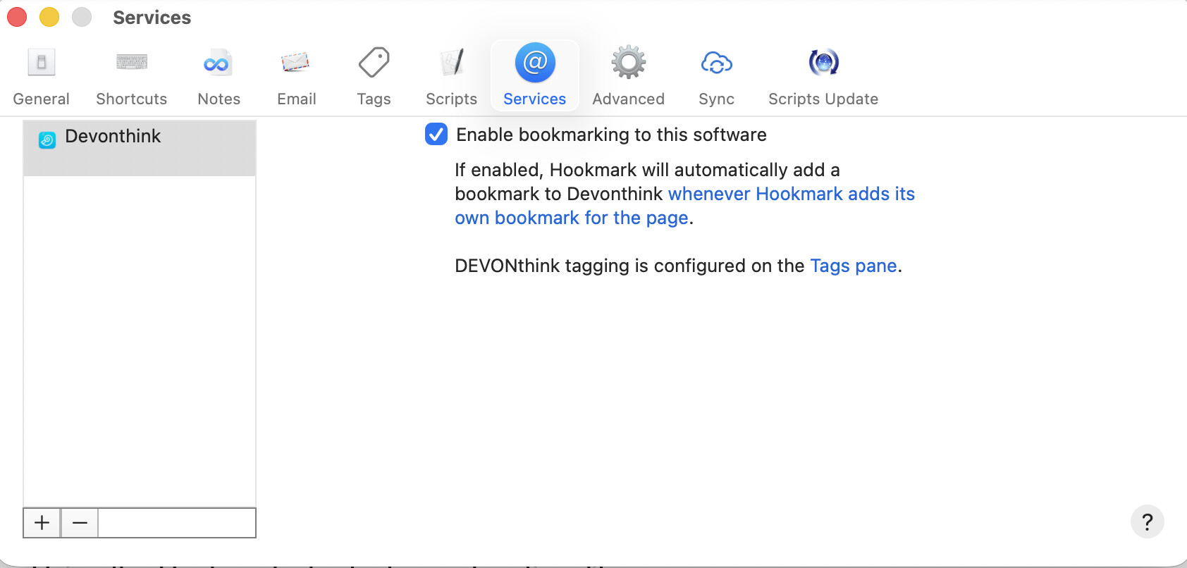 - NEW: Added a new Hookmark Services setting to automatically create a new bookmark in DEVONthink for any new web bookmark added to Hookmark.