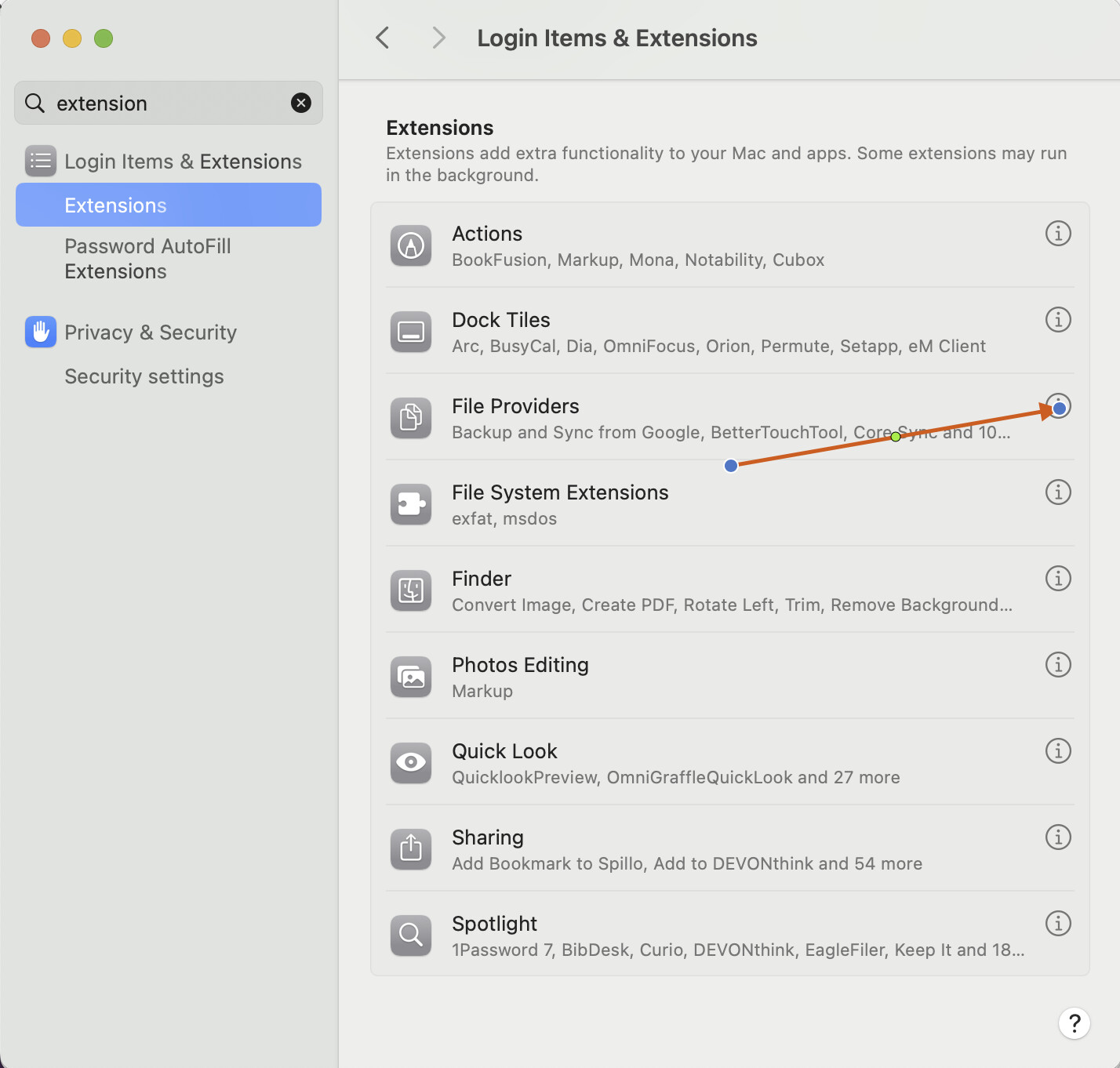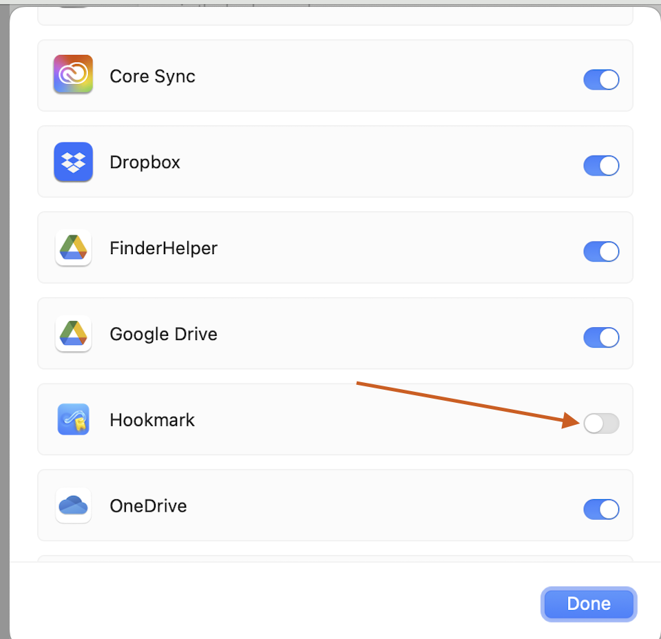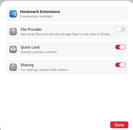 The interface looks a bit different in Tahoe than what is shown in the screenshots provided by bchend in his response. As I mentioned in my post, if you go to System Settings > Login Items & Extensions > Extensions > Hookmark and then click on the “i” icon (the “i” inside the circle). Then turn off the “File Provider” as shown in the screenshot below.