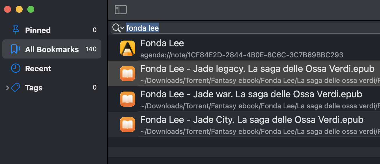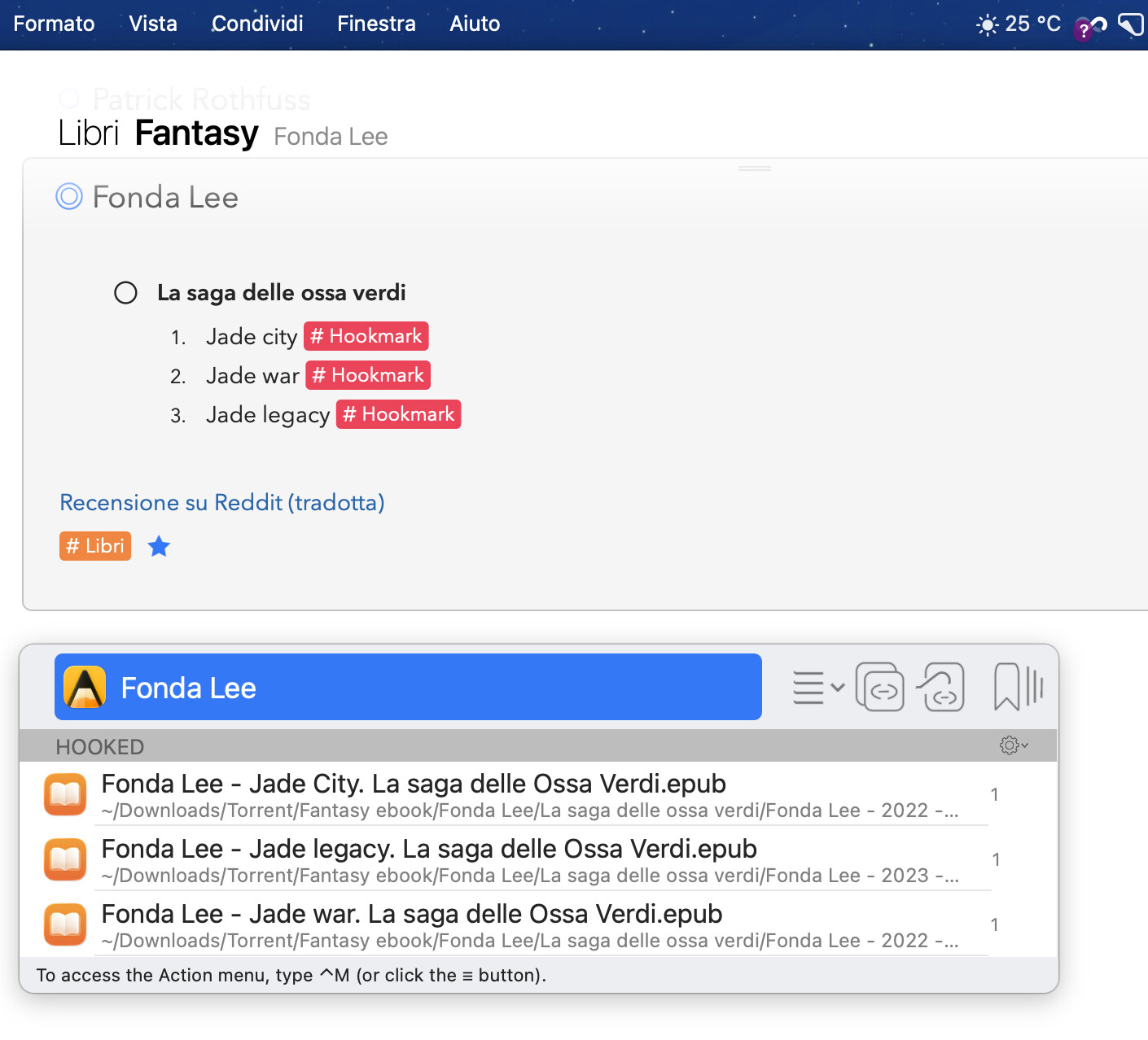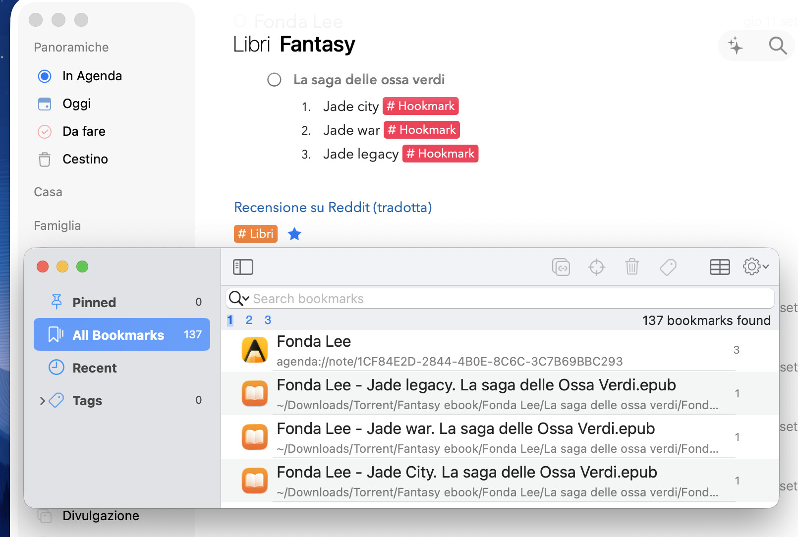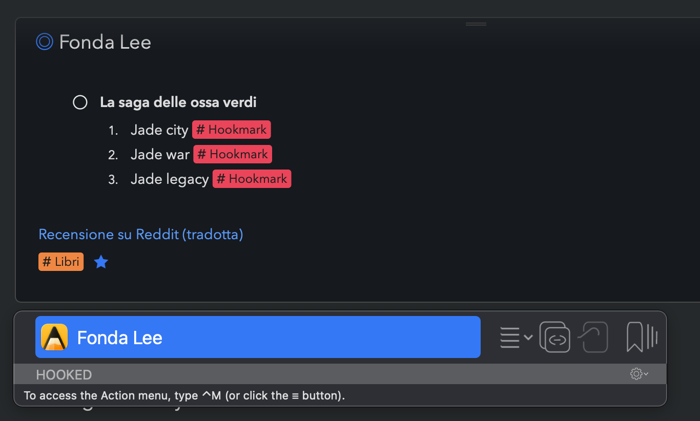 Hello, I am using Hookmark extensively on my Mac. The problem I am facing is that I tend to forget what is hooked. Today, for example, I was adding a list of PDFs I intend to read in the future into a note in my Agenda app, and linked them to the PDF file located on my filesystem. To be sure I immediately known there is something hooked, I added “(hook)” at the end of the line in Agenda. I could have added a comment into finder and show its column, but my intention was to use my note in Agenda as main reference with links.