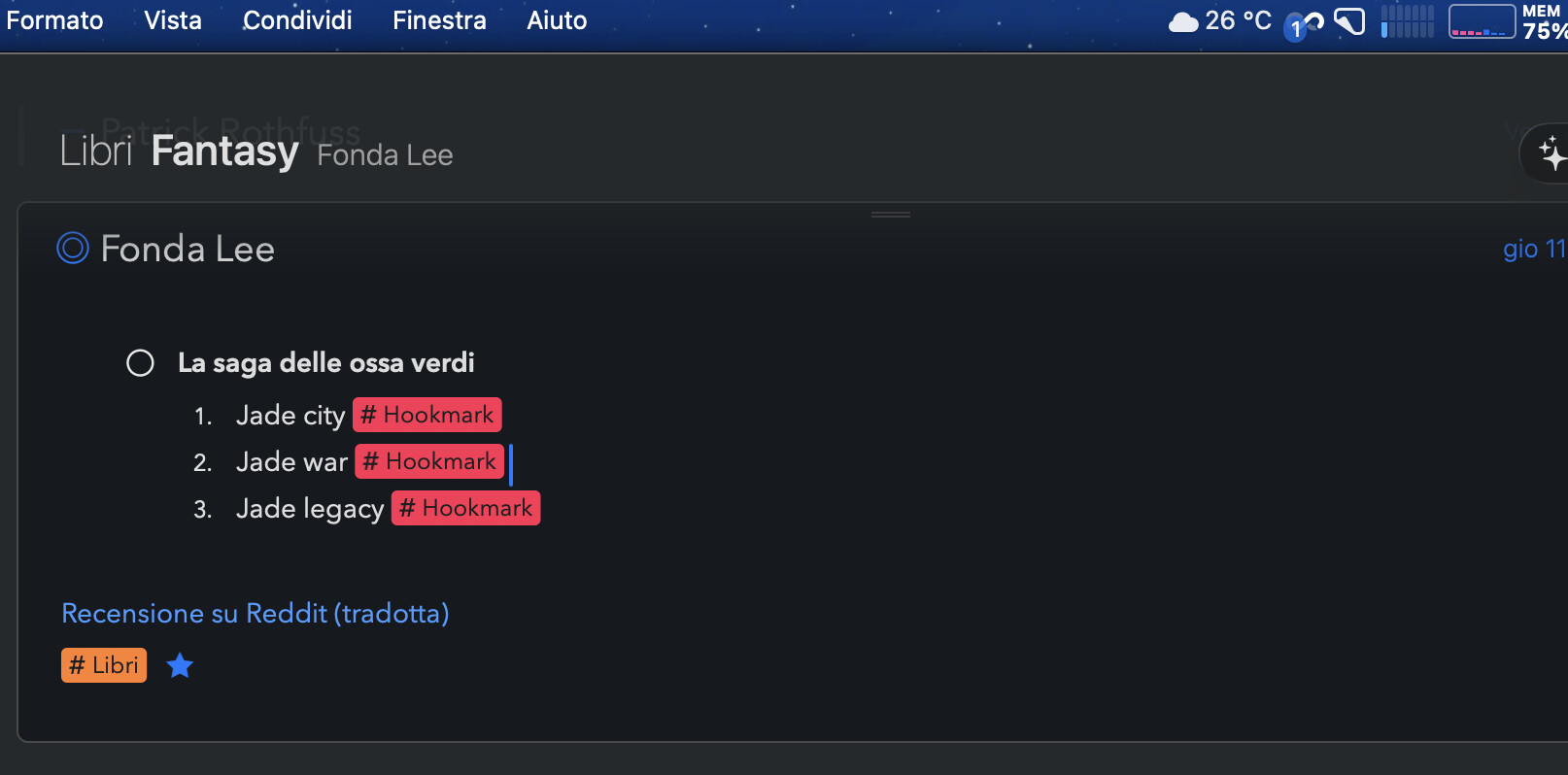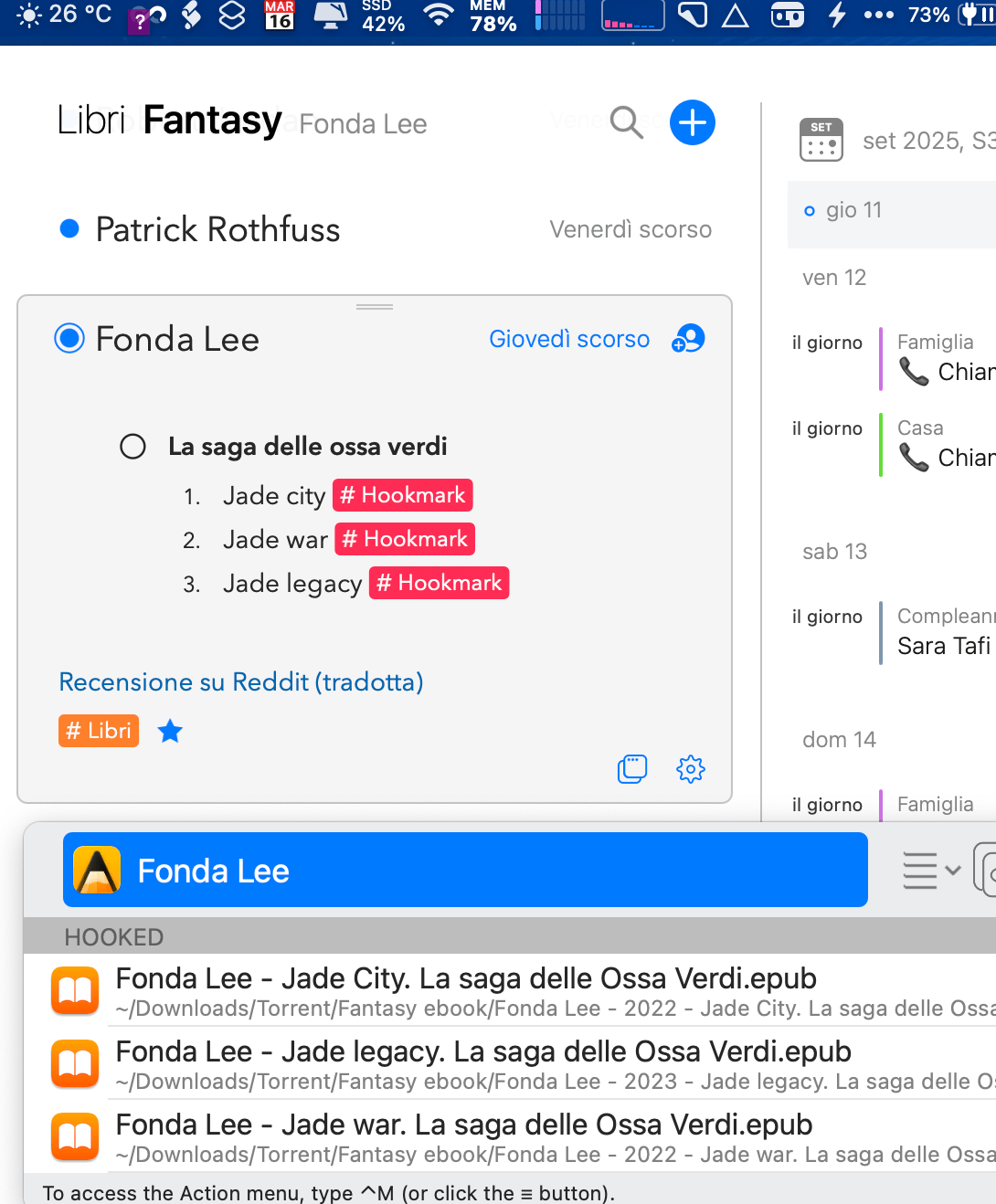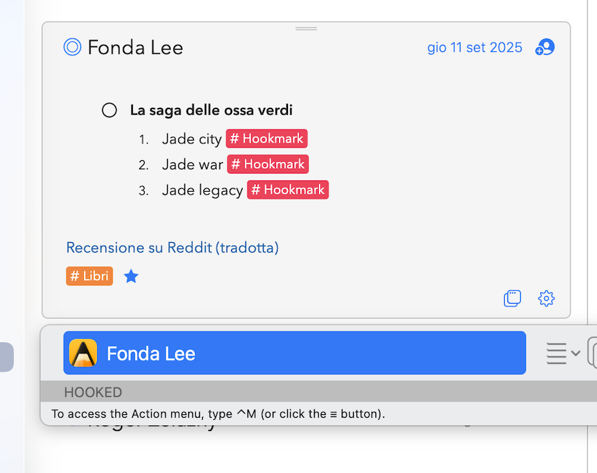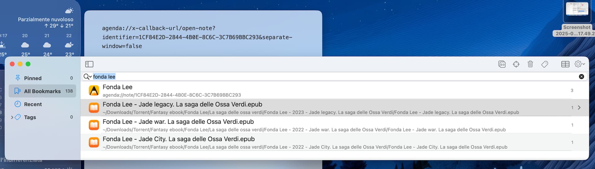 Hello, I am using Hookmark extensively on my Mac. The problem I am facing is that I tend to forget what is hooked. Today, for example, I was adding a list of PDFs I intend to read in the future into a note in my Agenda app, and linked them to the PDF file located on my filesystem. To be sure I immediately known there is something hooked, I added “(hook)” at the end of the line in Agenda. I could have added a comment into finder and show its column, but my intention was to use my note in Agenda as main reference with links.
