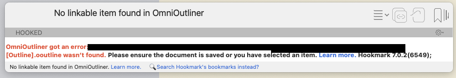 I’m having a problem with Hookmark 7 and an OmniOutliner file that’s been imported into a DEVONthink database. Up until HM version 7, I could open the file in OmniOutliner 6 and launch the Hookmark window from there. That no longer works; Hookmark tells me that the file either doesn’t exist or hasn’t been saved, neither of which is true. I mean, it used to work with OmniOutliner 6 as well. I recently updated OmniOutliner to v 6.0.4 and also enabled OmniLinks, but I don’t know how the latter might be relevant. It works with other files in their applications (PPT, etc.). Note: I didn’t run Hookmark from DEVONthink, but directly from OmniOutliner, PowerPoint, etc.