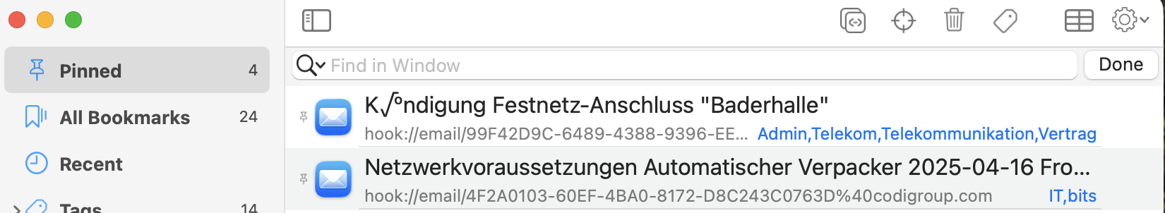 Hi, there! I am using Hookmark (latest version) and actual Hookmark PAL. Syncing leads to an error, if German Umlaute (special characters like ÄäÖöÜüß) are included in the title. Pls look at the screenshot, where the correct word should be Kündigung!