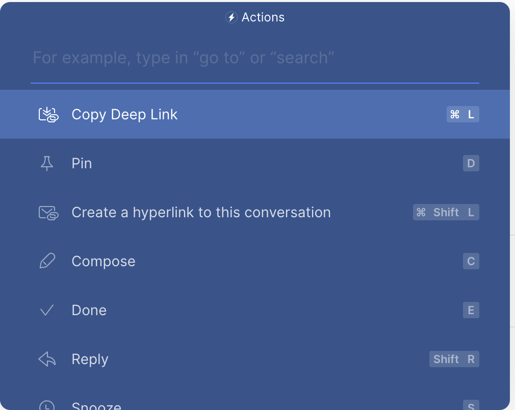 Hookmark uses the shortcut command+”L” to get the email deeplink. If you press command+l in a Spark email, what do you get? You can check if the shortcut for Copy Deep Link is command+L.