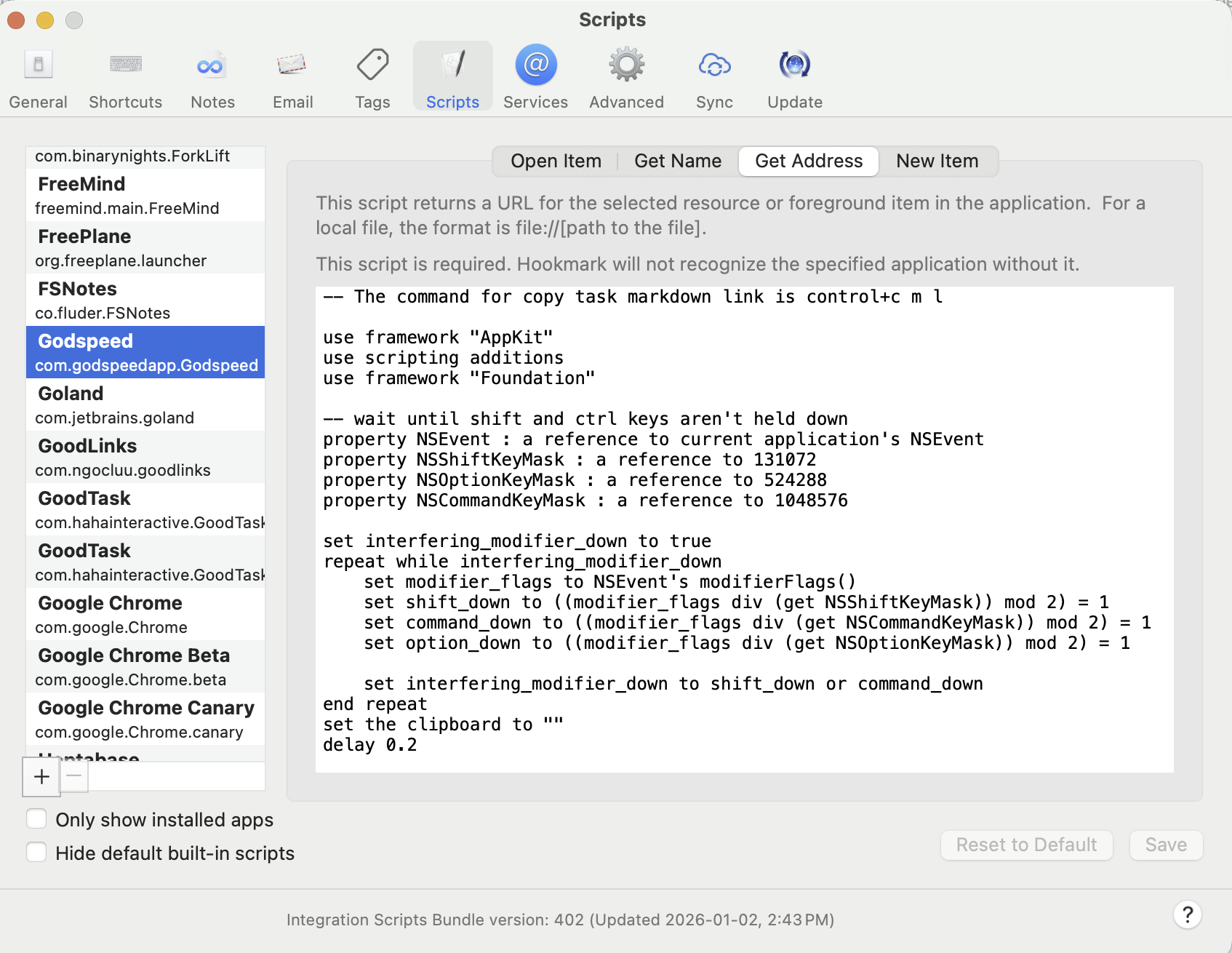 Just wanted to query this, am on Hookmark 6.13(6451) Integration v.402 but Godspeed is not showing in my script list (and isn’t otherwise working). I did the Godspeed set up. Anything I might be missing?