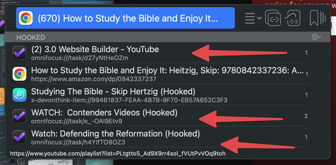 I often link external resources to specific Youtube videos. When I invoke Hookmark from the external resource, the Youtube bookmark comes up correctly. BUT… if I am on a Youtube video that has been hooked and I invoke Hookmark, from there - the correct external links are shown ALONG WITH other bookmarks that are not related to that Youtube video. See the example image… three additional bookmarks are displayed that are NOT related to the hooks I’m looking for. This happens with a number of Youtube video hooks I have created.